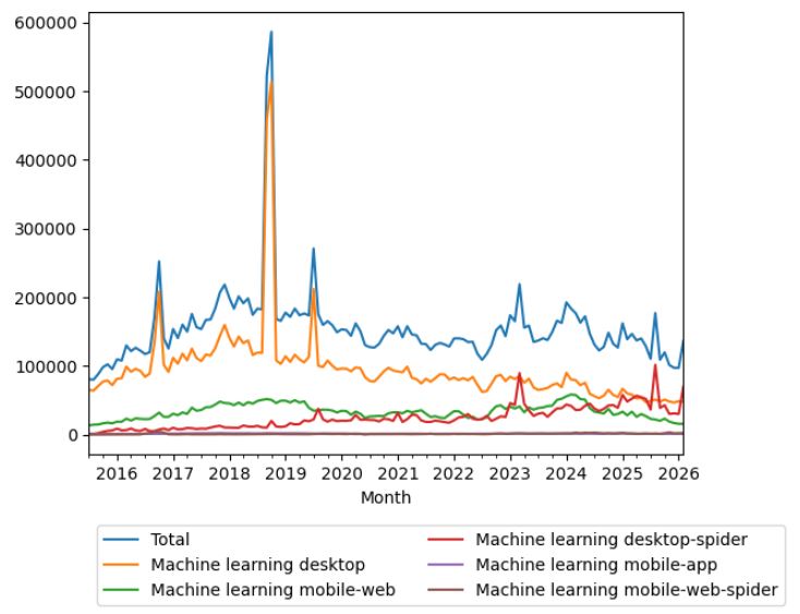 | 01:30, 25 March 2026 | Machinelearningwikipediaviewsmarch2026.JPG (file) | 48 KB | Sebastian (talk | contribs) | This chart shows monthly Wikipedia pageviews for the {{w|Machine learning}} article from 2015 to 2026, segmented by access platforms (desktop, mobile web, mobile app, and spiders). It highlights overall traffic trends, seasonal fluctuations, and notable spikes, reflecting growing public interest and shifting patterns in how users access machine learning content online.<ref>{{cite web |title=Wikipedia Views: Machine learning page statistics |url=https://wikipediaviews.org/displayviewsformultip... | 1 | |