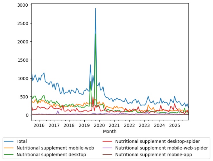 - ↑ "Google Trends: "nutritional supplement"". Google Trends. Google LLC. Retrieved 29 January 2026.
